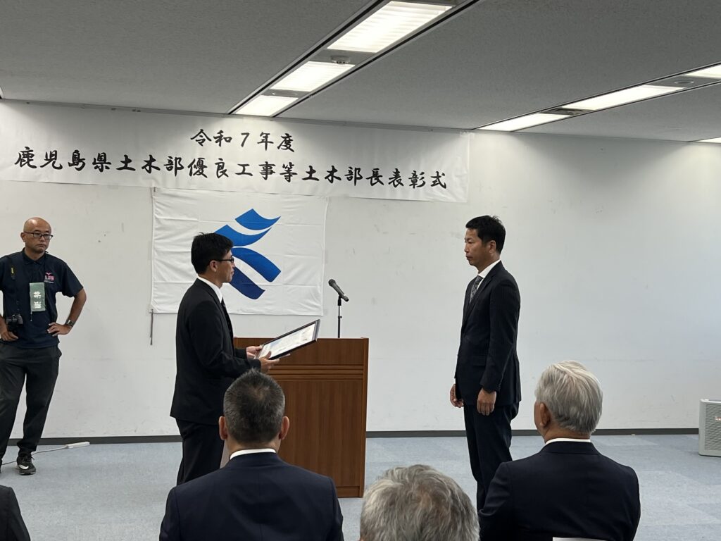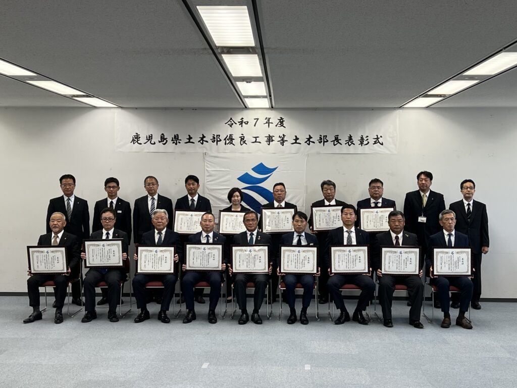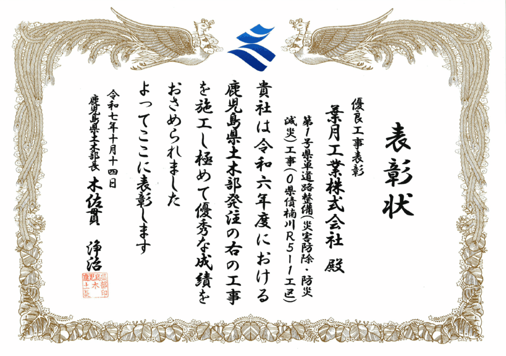 令和7年度土木優良工事等表彰式 令和7年10月14日に令和7年度鹿児島県土木優良工事等土木部長表彰式が行われ、葉月工業からは下記の工事が表彰されました。 工事名:第1号県単道路整備(災害防除・防災減災)工事 (0県債楠川R5-1工区)