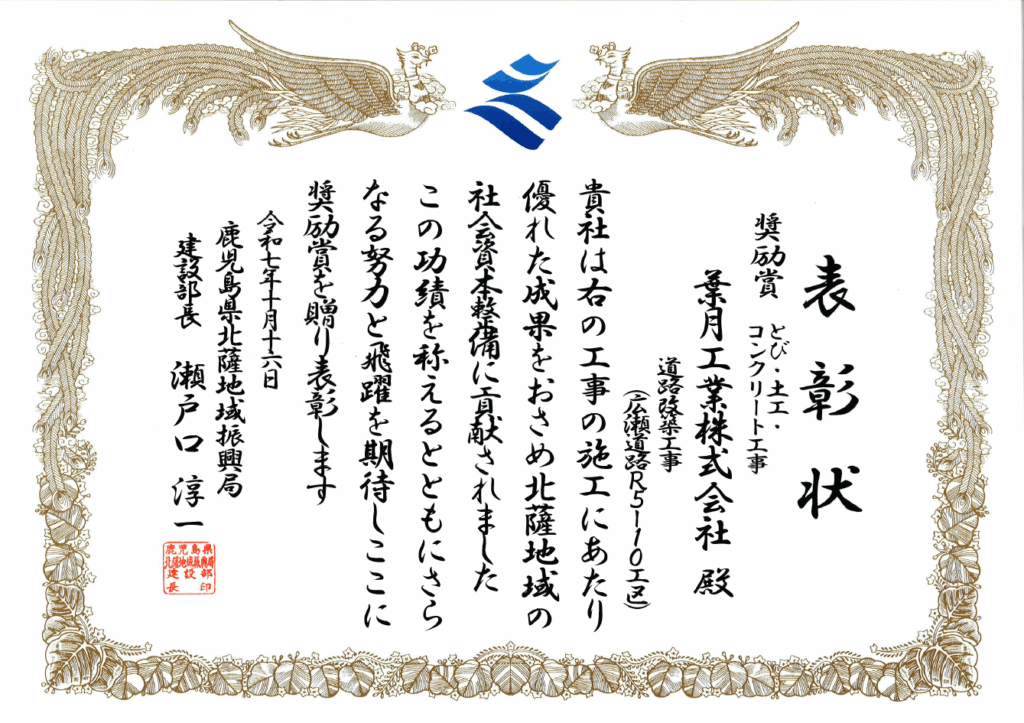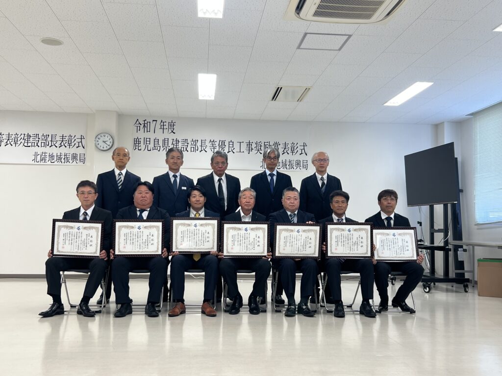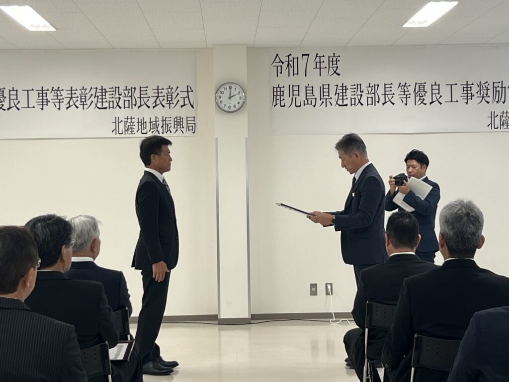 令和7年度鹿児島県土木部優良工事等土木部長表彰式(北薩地域振興局) 令和7年10月16日に執り行われました 令和7年度鹿児島県土木部優良工事等土木部長表彰式(北薩地域振興局) において下記の工事が表彰されました。 工事名:道路改築工事(広瀬道路R5-10工区)